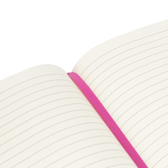 Libreta con 80 hojas de raya. Incluye separador de hojas y elástico para cerrar.