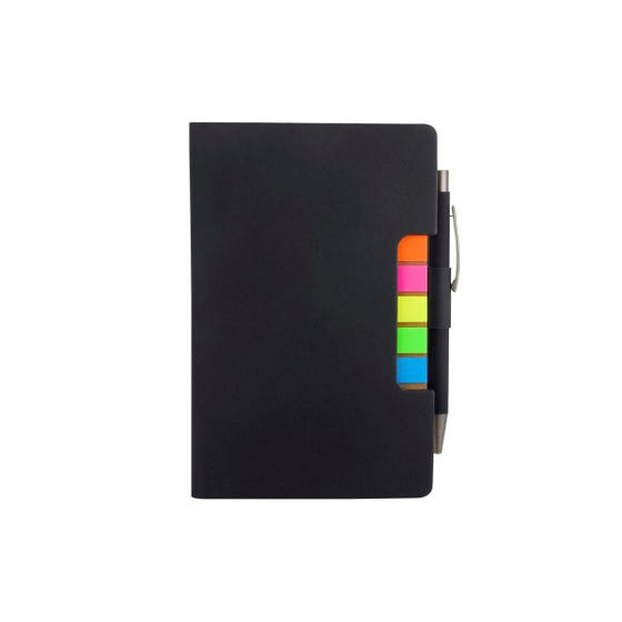 Libreta con 70 hojas de raya. Incluye bolígrafo y notas adheribles de colores.
