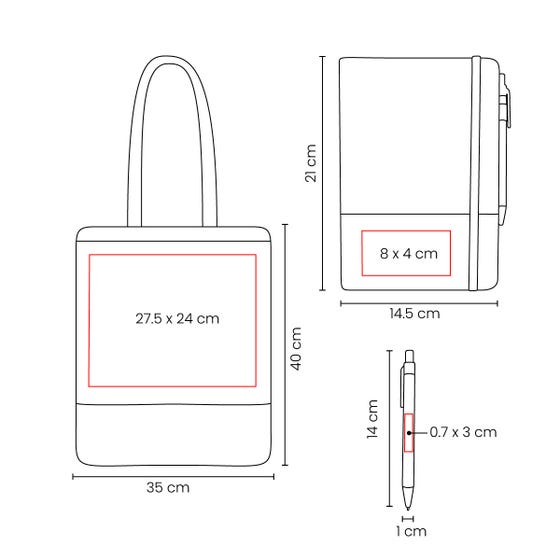 | Área | 20 x 15 cm Caja / 27.5 X 24 cm Bolsa / 8 x 4 cm Libreta / 0.7 x 3 cm Bolígrafo |