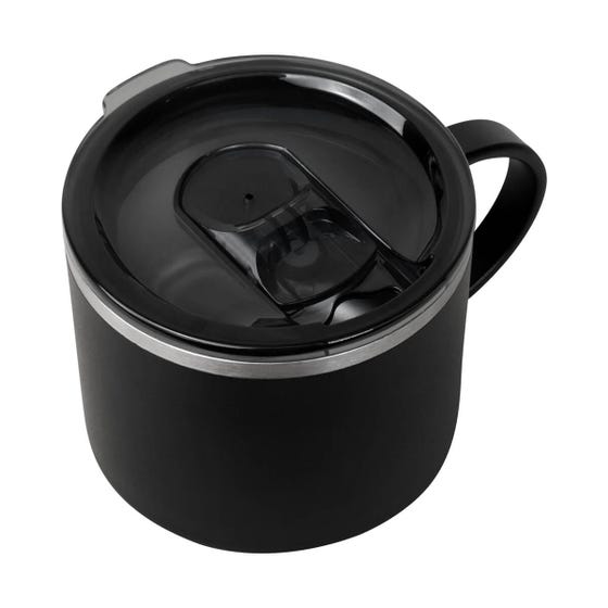 Taza doble pared. Cerrado al vacío. Pared interna y externa de acero inoxidable. Terminado rugoso. Incluye tapa de plástico con sistema push y válvula de seguridad. Mantiene temperatura caliente 6 hrs y temperatura fría 12 hrs. Incluye caja individual.