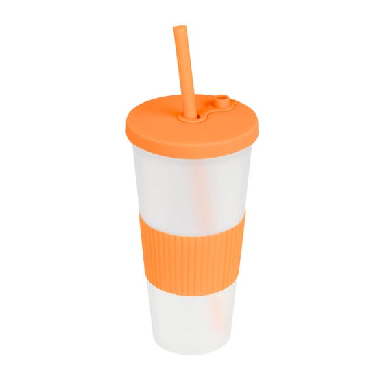 Vaso doble pared. Pared interna y externa de plástico. Tapa de plástico con sistema de rosca. Incluye popote. Cuerpo frosty con terminado suave. Su diseño con manga de silicón antideslizante garantiza un agarre cómodo y seguro. Capacidad 22 Oz. Base de 6.4 cm de diámetro. Caja individual incluida.